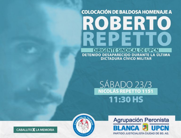 Este sábado 23 de marzo a las 11:30 horas, la Agrupación Peronista Blanca junto a los compañeros de Caballito por la memoria y la Comisión de trabajo por la reconstrucción de nuestra identidad colocamos la baldosa en homenaje al compañero desaparecido en la última dictadura cívico-militar el dirigente de la Unión Personal Civil de la Nación (UPCN) Roberto Repetto.