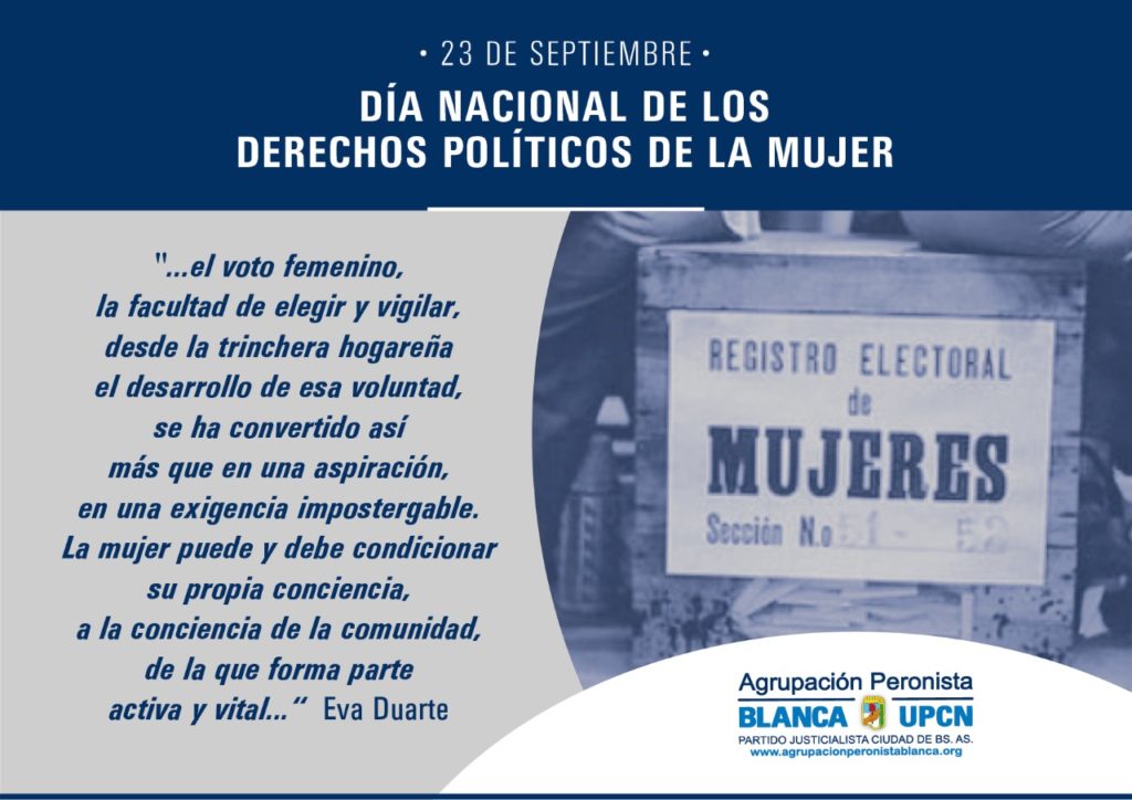 Desde 1997 el 23 de septiembre se conmemora el De Nacional de los Derechos Políticos de la Mujer, en homenaje a la promulgación de la ley 13.010 de 1947, la cual no solo estableció el voto femenino, sino que permitió la llegada a cargos políticos de la mitad de la población que estaba excluida.