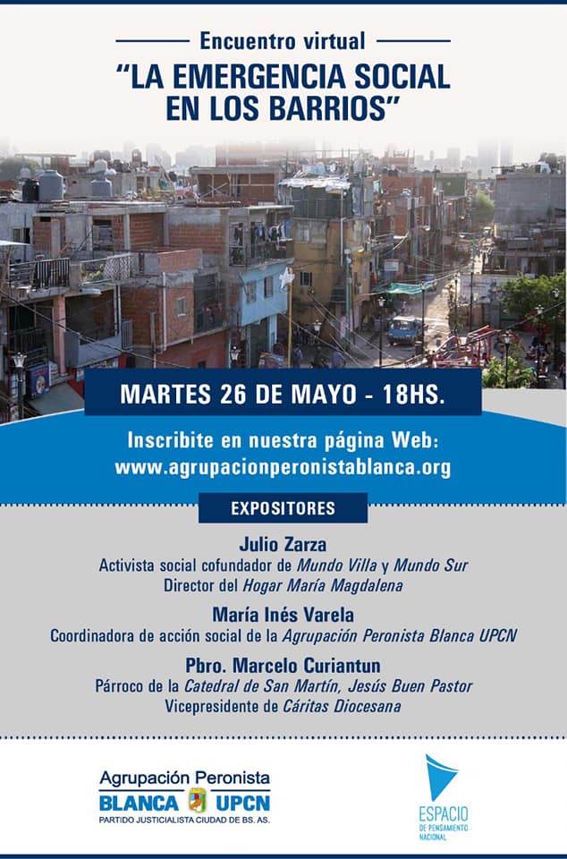El martes 26 de mayo realizamos una charla virtual en la cual la temática fue “la emergencia social en los barrios”, tema que está muy en boga hoy a raíz de la crisis sanitaria y económica provocada por el COVID19 lo que hacer que los problemas que viven los barrios populares sean más evidentes y compliquen más la situación.