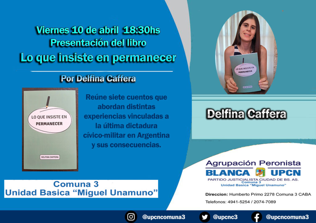 En el marco de su presentación, Lo que insiste en permanecer, de Delfina Caffera, se propone como una obra que invita a mirar el pasado reciente desde sensible, pero no tan crudo como otros textos. Publicado por Publicación de libros de autor, el libro reúne siete cuentos que, sin caer en lo explícito, construyen un entramado de experiencias atravesadas por la memoria de la última dictadura cívico-militar argentina.